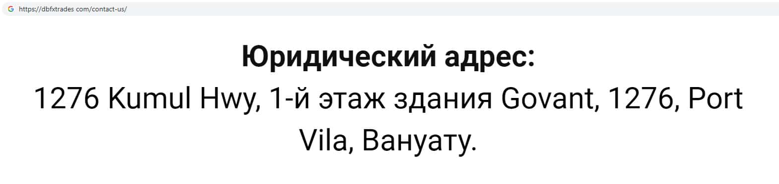 Мошенническая организация DBFXTrades, главный офис которой находится на островном государстве Вануату, на своем официальном сайте указала номер контактного телефона своей организации, а так же указывает адрес электронной почты своей конторы, который указан ниже: