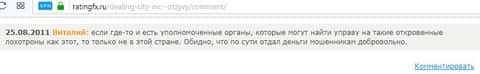 Следующего клиента мошенники Дилинг Сити настолько достали, что он теперь ищет какие-нибудь уполномоченные органы, дабы они смогли засудить их. Они не просто достали человека, а украли у него деньги. Хоть он и сам в добровольном порядке перевел мошенникам деньги, но все же звонари Dealing City давили на него и он сломался. Это уже идет по статье вымогательства с применением психологического оружия.