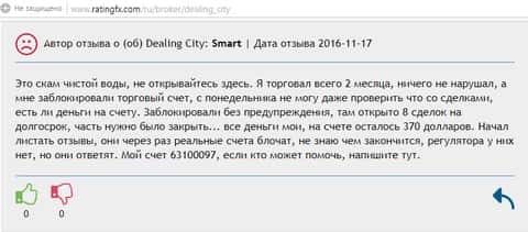Следующему автору отзыва, мошенники Dealing City заблокировали счет, сообщив, что он нарушил какие-то правила. При чем на счету осталось несколько открытых сделок и сумма на балансе составляла 370 долларов. Как он не пытался выяснить информацию по поводу разблокировки аккаунта, никто ему внятного ответа не дал, да и деньги остались навсегда лежать на счетах конторы Дилинг Сити.