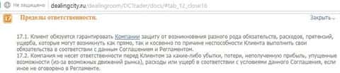 Судя по тексту договора брокерской конторы Дилинг Сити, если разобрать отдельно каждый раздел, то в основном встречается фраза "клиент должен". Сразу возникает множество вопросов, так как обязанностей компаний перед клиентов процентов 10, не больше. Из одного раздела стало ясно, что ДЦ Dealing City не несет ответственность перед клиентом за какие-либо убытки, потери, неполученную прибыль и тд. А перед этим кухня требует от жертвы гарантий, что он не принесет ей никаких неудобств в случае возникновения этой ситуации. Так что хитрый план жуликов Дилинг Сити раскрыт.