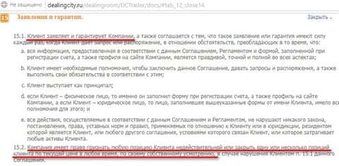 А дальше еще интересней раздел по поводу заявлений и гарантий. Аферисты вписали в свой договор то, что клиент заявляет и гарантирует компании, а не наоборот - и это очень настораживает. Получается компания Дилинг Сити ничего нигде никому не обязана, в отличие от ее клиентов. Также есть один пункт со словами, что кухня имеет право не признать сделки клиента и закрыть их в любой момент. Тоже абсурдное заявление, после которого вряд ли кто захочет вкладывать деньги.