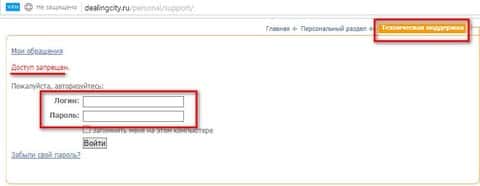 Если зайти на сайт шарлатанской организации Дилинг Сити, то контактную информацию довольно сложно найти. А вернее практически невозможно. Есть там кнопка "Обратиться в поддержку" и при ее нажатии мы переходим на панель входа в личный кабинет.