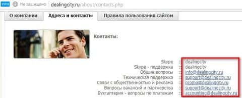 Но, поискав более тщательно, в разделе "О компании", можно найти те адреса и контакты дилинговой кухни Дилинг Сити которые мы искали. Здесь есть как данные скайпа, так и различные электронные почты. Ниже приведем их в более подробном виде: