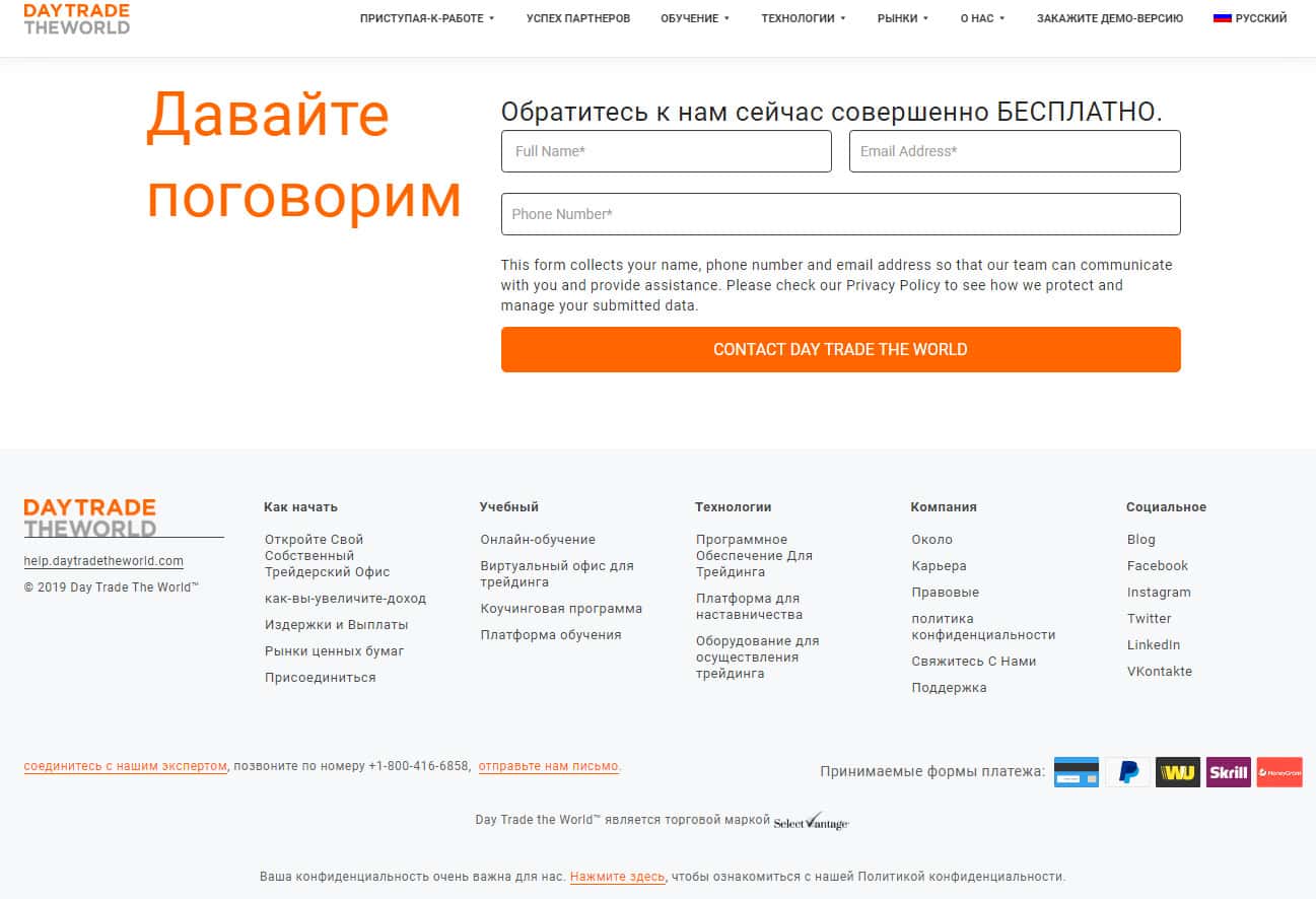 Завершается же сайт у мошенников Day Trade the World вполне ожидаемо, а именно типичной формой для связи с наивной клиентурой, а так же стандартным меню со ссылками на различные разделы подвального сайта аферистов Дей Трейд зе Ворлд. На изображении, расположенном ниже, вы можете наглядно увидеть окончание сайта шулеров.