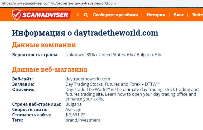 В связи с мошеннической и противозаконной деятельностью лохотрона Day Trade the World их реальные руководители предпочитают анонимность дабы избежать ответственности со стороны правоохранительных органов. Информацию о самом же сайте жулья Дей Трейд зе Ворлд можно узнать с помощью портала scamadviser com, что вы можете увидеть ниже.
