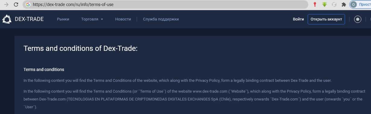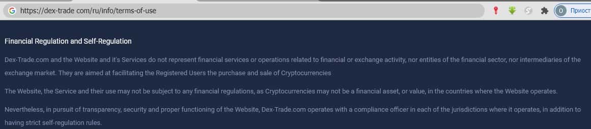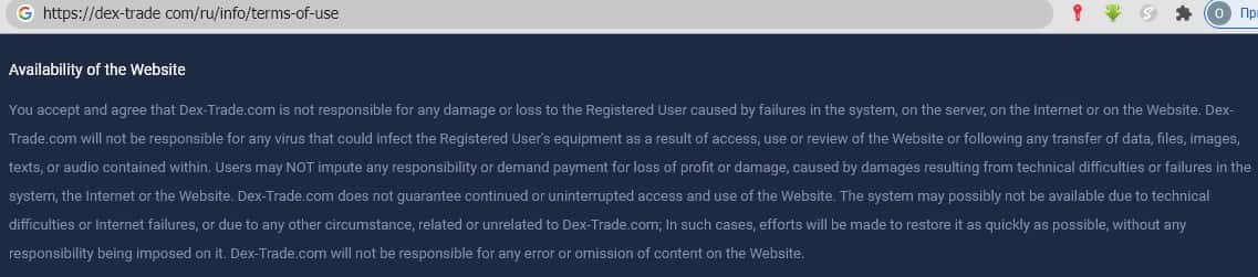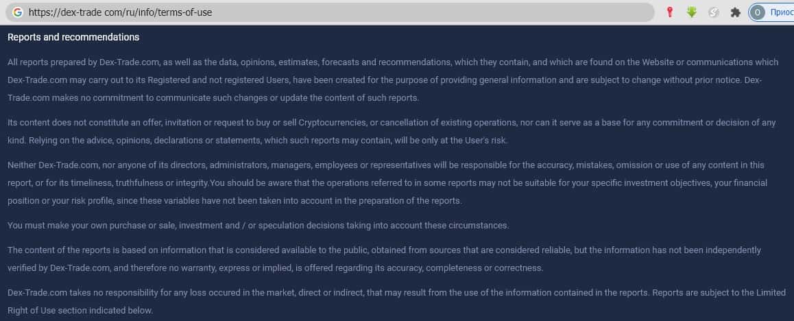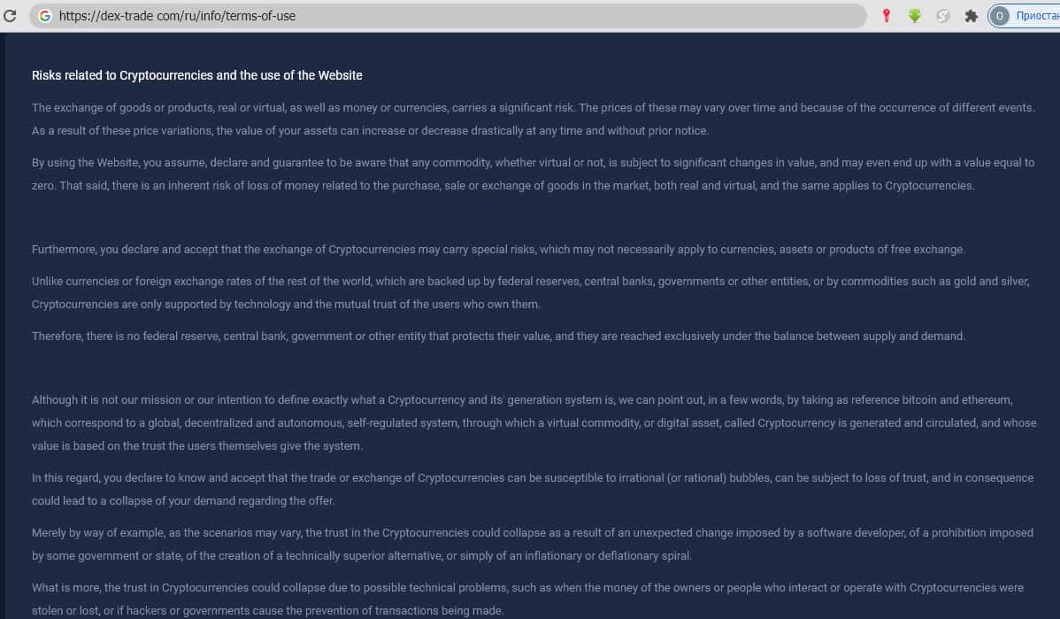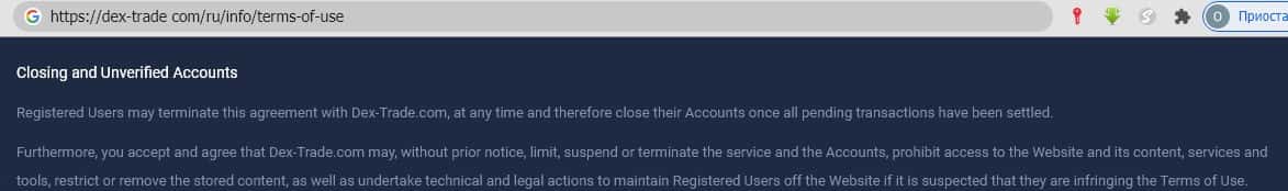 - Обзор клиентского соглашения, опубликованного на портале мошенников dex-trade com