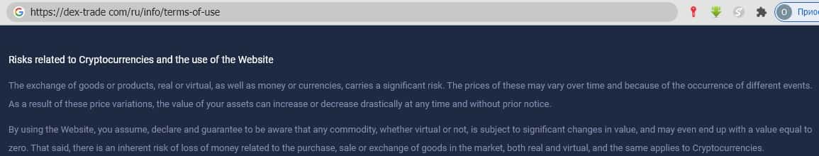 Мошенники из Декс Трейд предупреждают своих клиентов заранее, что использование их ресурса сопряжено с финансовым риском вплоть до полной потери денежных средств клиента.