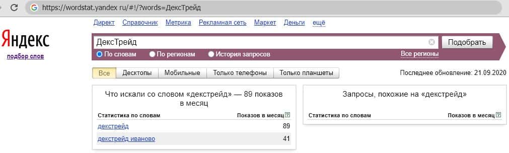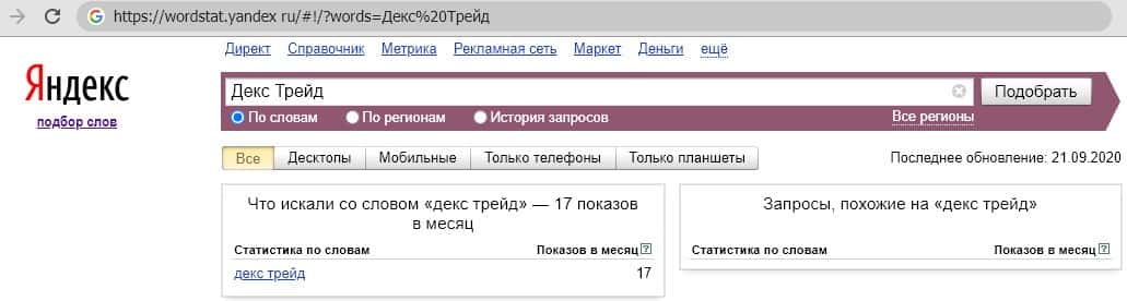 Нет отличий в количественном анализе поисковых запросов бренда "ДексТрейд", написанного слитно.