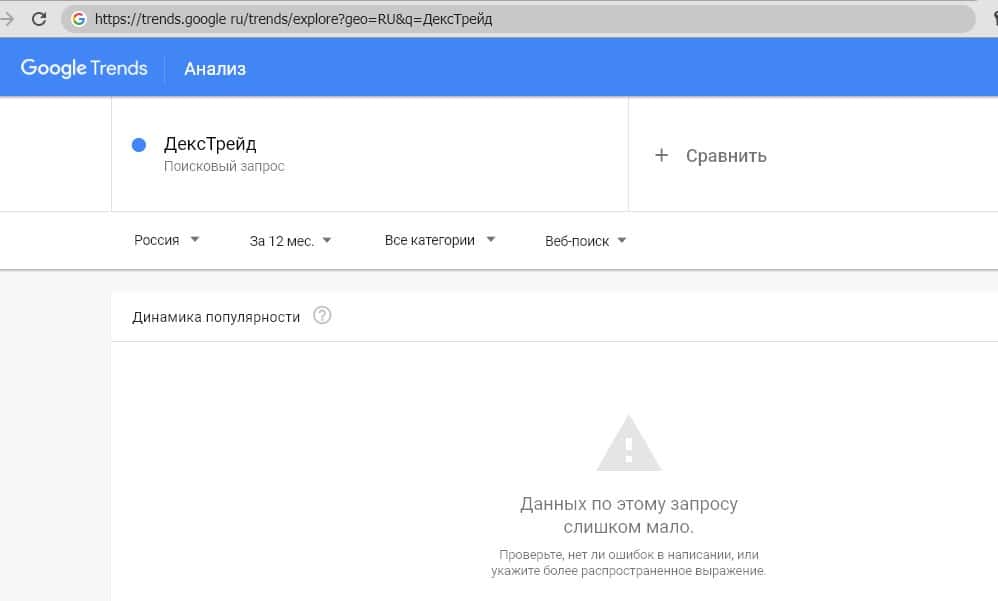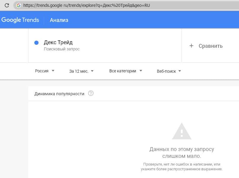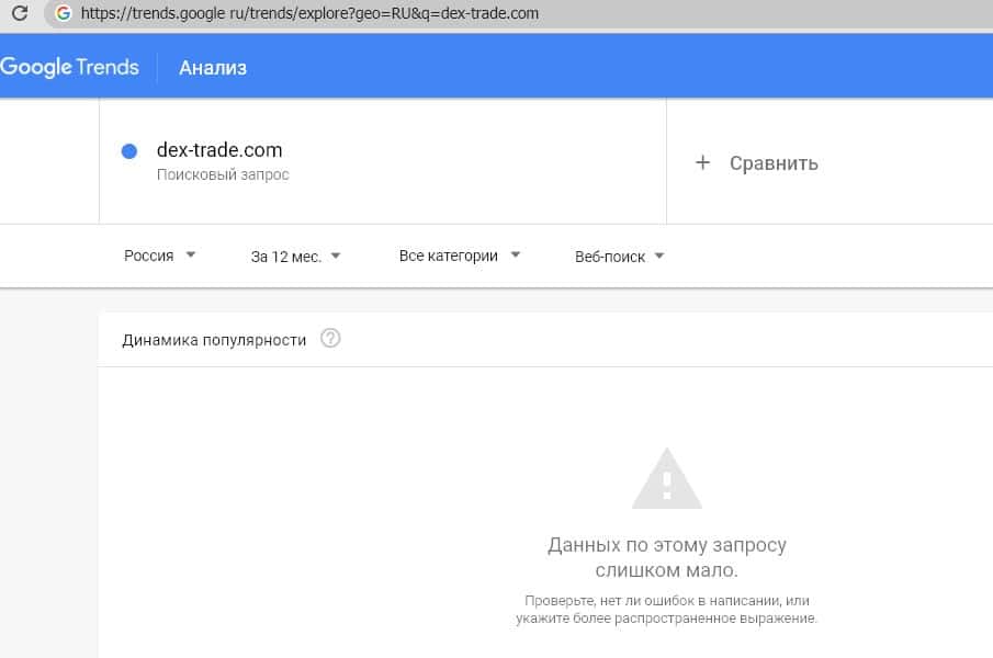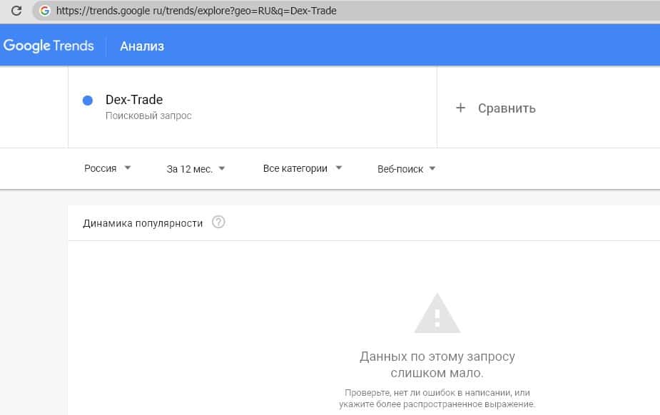 Поиск сайта мошеннической криптобиржи "dex-trade.com" также особо никого не интересует судя по данным Google Trends.