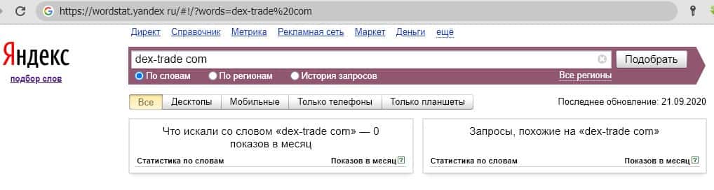 Исходя из анализа показателей портала Dex-Trade, приведенных выше, становится предсказуемым низкий уровень количества поисковых запросов данного бренда в поисковых системах.