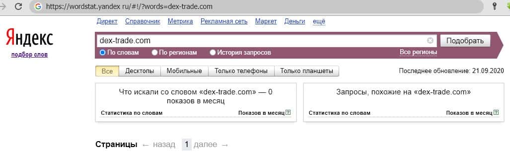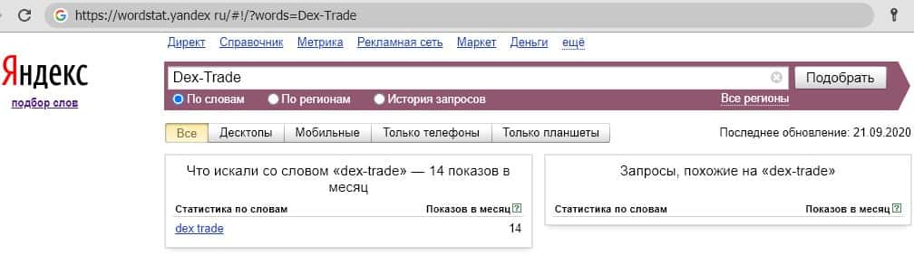 Такие же результаты мы видим и по запросу бренда "Dex-Trade" на английском языке. Слишком мало поисковых запросов для количественного анализа.
