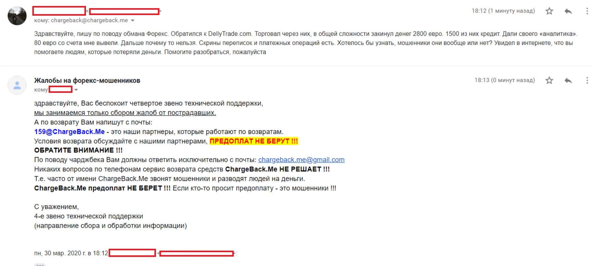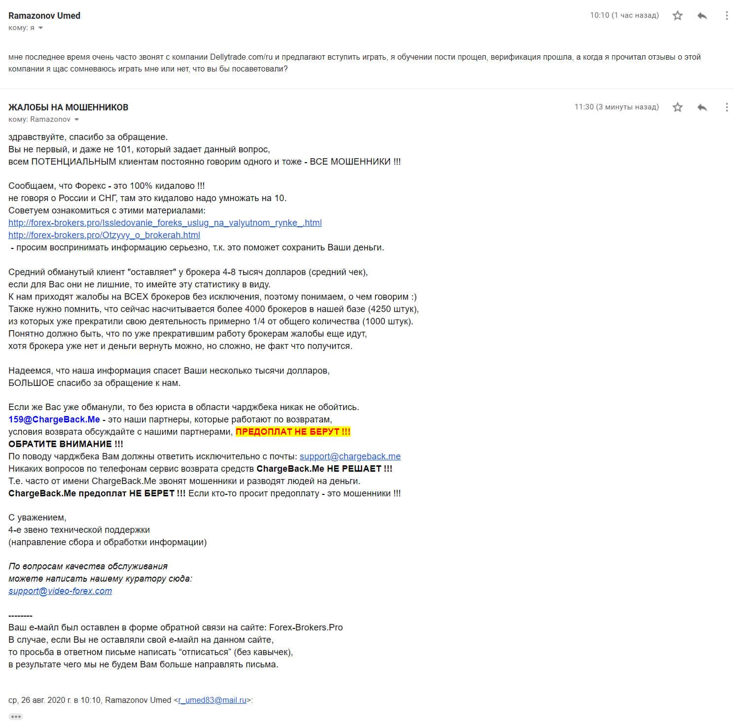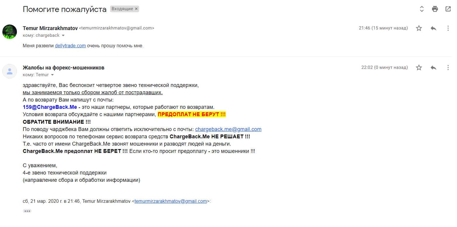 В данном разделе предлагаем ознакомится с информационным материалом в виде скрина сообщения, присланного на почту сайта-разоблачителя от человека, который в будущем может стать жертвой мошенничества аферистов Делли Трейд.