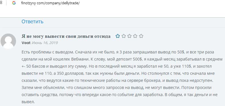 Реальный негативный отзыв от человека, которого попыталась кинуть жульническая контора DellyTrade