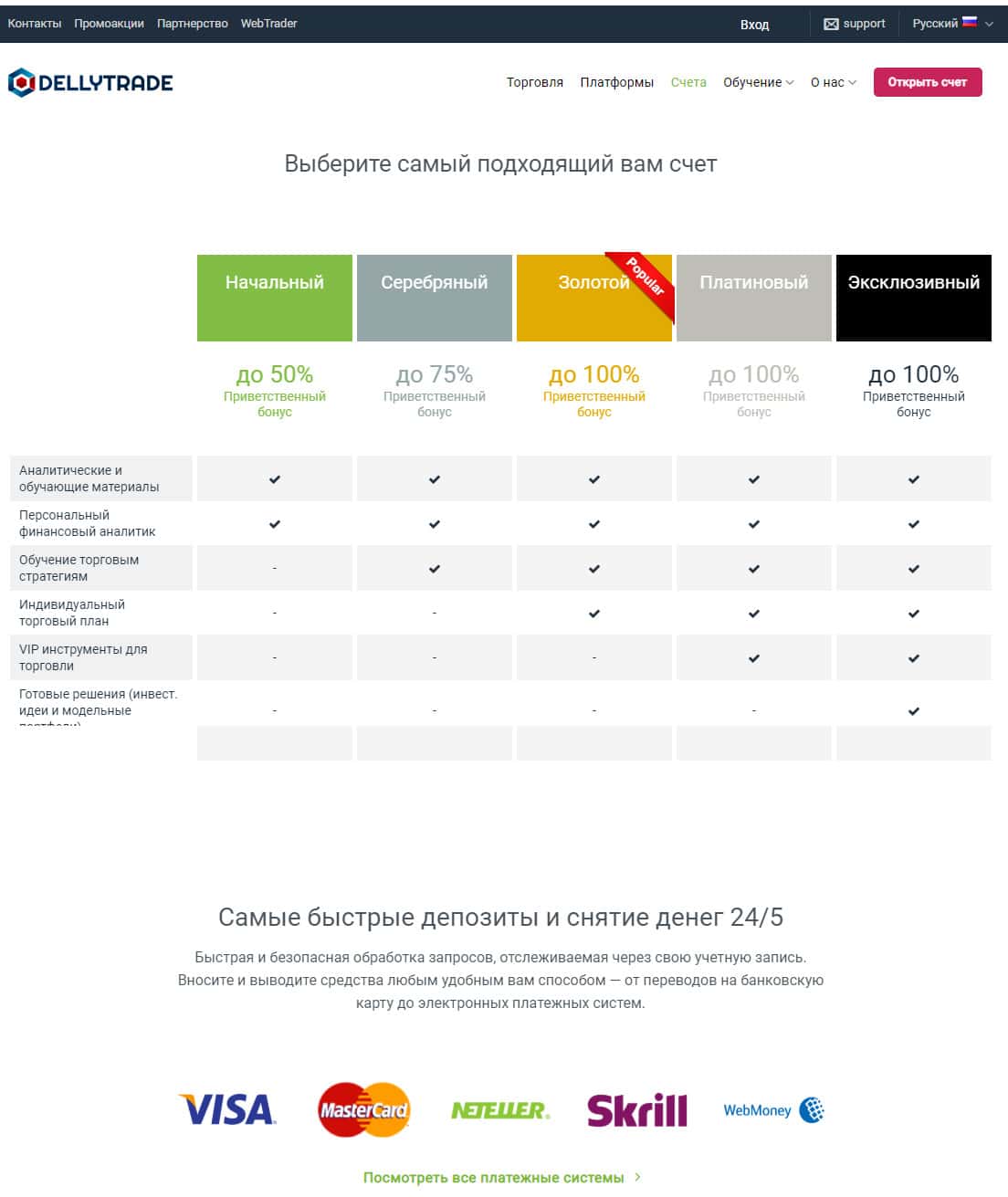На следующем разделе веб-страницы Делли Трейд, которая посвящается счетам, проходимцы данного сайта прямым образом красочно описывают всевозможные счета, благодаря которым Вы в миг разбогатеете, хотя по факту итог Вам уже известен - Ваши деньги навсегда уйдут им.