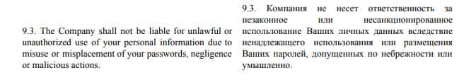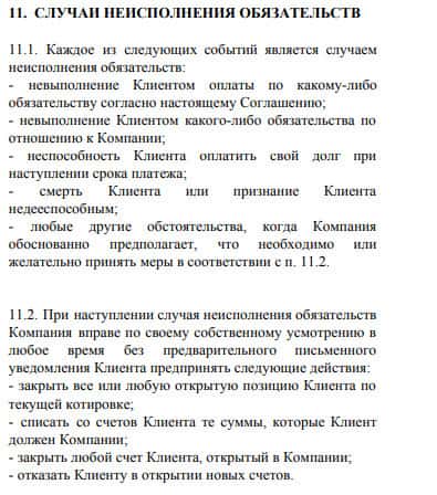 Весьма занимательный пункт 11.1. Случаи неисполнения обязательств, где подробно расписано, что будет ожидать, в случае нарушения договора клиента, но ни единого слова о санкциях, которые будут ожидать саму компанию. Явное нарушение законодательства и партнерских соглашений в любом двустороннем договоре.