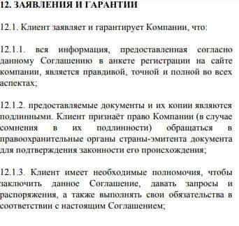 Следующий 12 раздел договора: "Заявления и гарантии" также не сильно по своей политике не отличается от 11 раздела. Расписано уйма случаев, как будет наказан клиент, и ни единого - что ожидает, в случае невыполнения своих обязательств компанию Dellytrade.