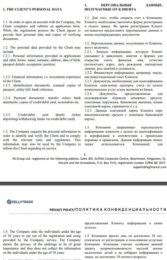 В первом разделе "Персональные данные, получаемые от клиента" у аферистов из DellyTrade следует информация о том, что с целью идентификации и верификации клиентов, надо предоставить свою персональную информацию. А с какой целью и куда пойдут эти данные, можно лишь предполагать и бояться за бедных, обманутых пользователей.