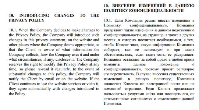 И последний 10 Раздел говорит о том, что Компания может в любой момент внести изменения а если клиент вовремя не прочтет об этом, то это его проблемы, так как проходимцы из нам известной Компании не обязаны в полной мере донести до своих клиентов эту информацию.