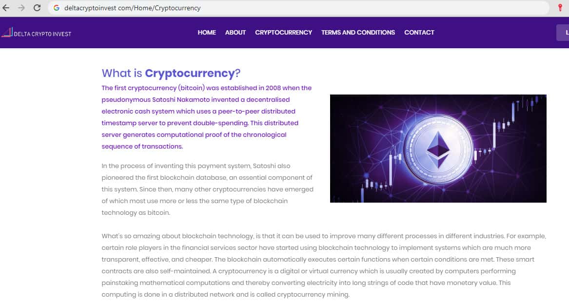 О нацеленности на неопытных новичков в деле инвестирования капитала говорит о наличии такого раздела портала Дельта Крипто Инвест, как "Криптовалюта", который содержит минимальные сведения о том, что есть криптовалюта, как она получается, зачем нужна и что с ней можно сделать.