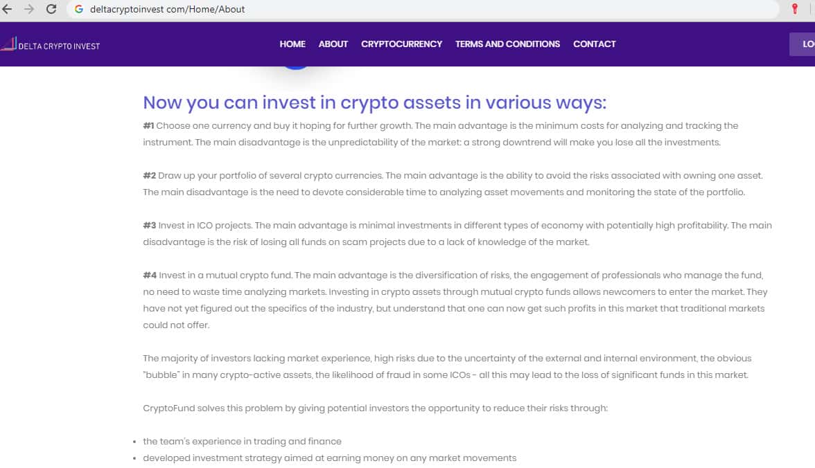 Проводя анализ способов инвестирования новичком в инвестиционном бизнесе, мошенники предупреждают "необстрелянных" инвесторов о возможных потерях их инвестиций и пытаются склонить инвесторов отдавать свои сбережения благородному и надежному инвестиционному фонду Делта Крипто Инвест.