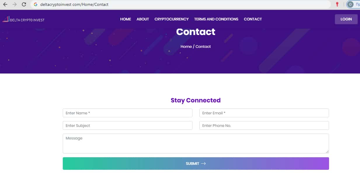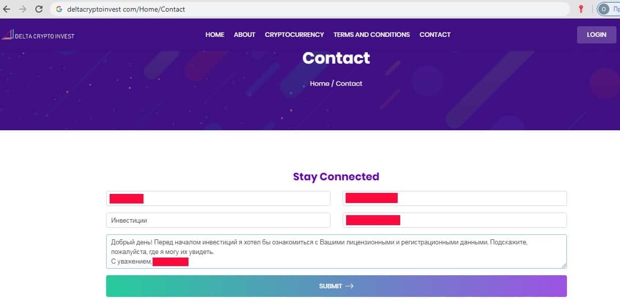 Среди контактных данных на портале Дельта Крипто Инвест значатся только контактные данные клиента, введенные в форму обратной связи. Мошенники не считают нужным оставлять о себе какой-либо информации, даже лживой. Это в очередной раз подтверждает наше мнение, что портал нацелен на одурачивание новичков, "домохозяек" и совсем далёких от инвестиций людей.
