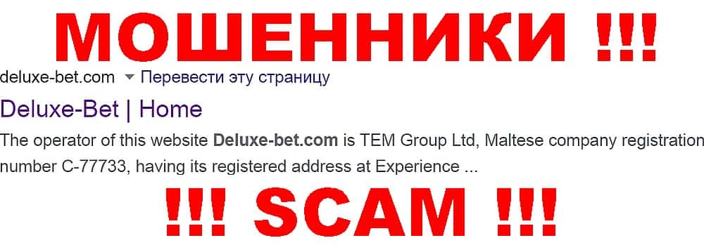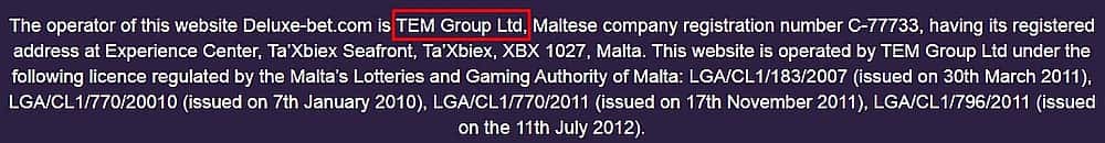 Следует обратить внимание, что в футере сайта аферистов deluxe-bet com, написано, что он управляется некой организацией, которая называется, по словам жуликов, TEM Group Ltd.
