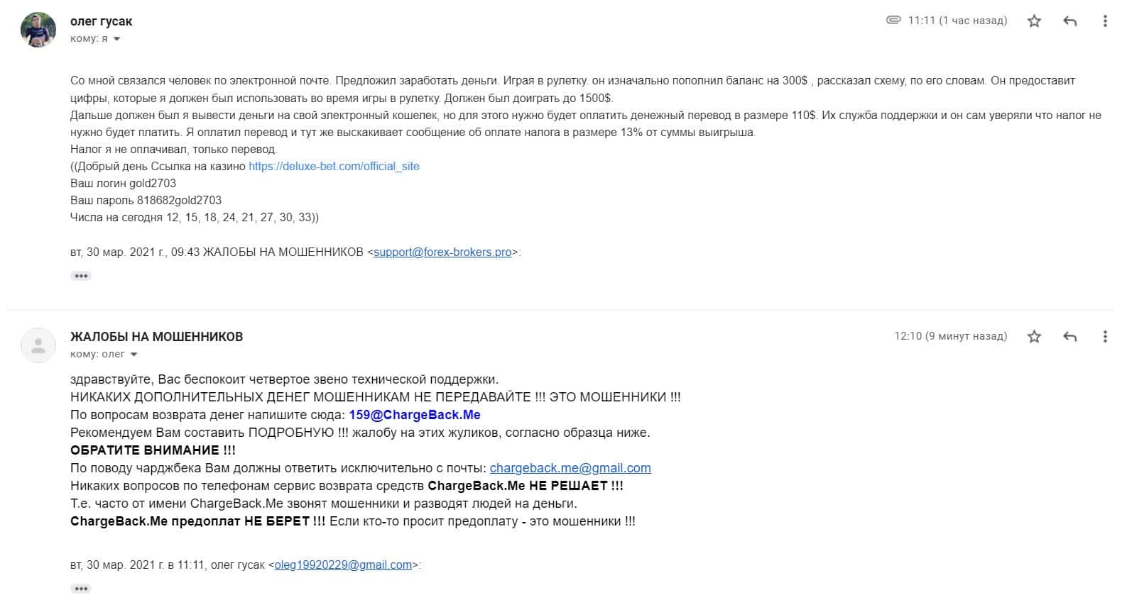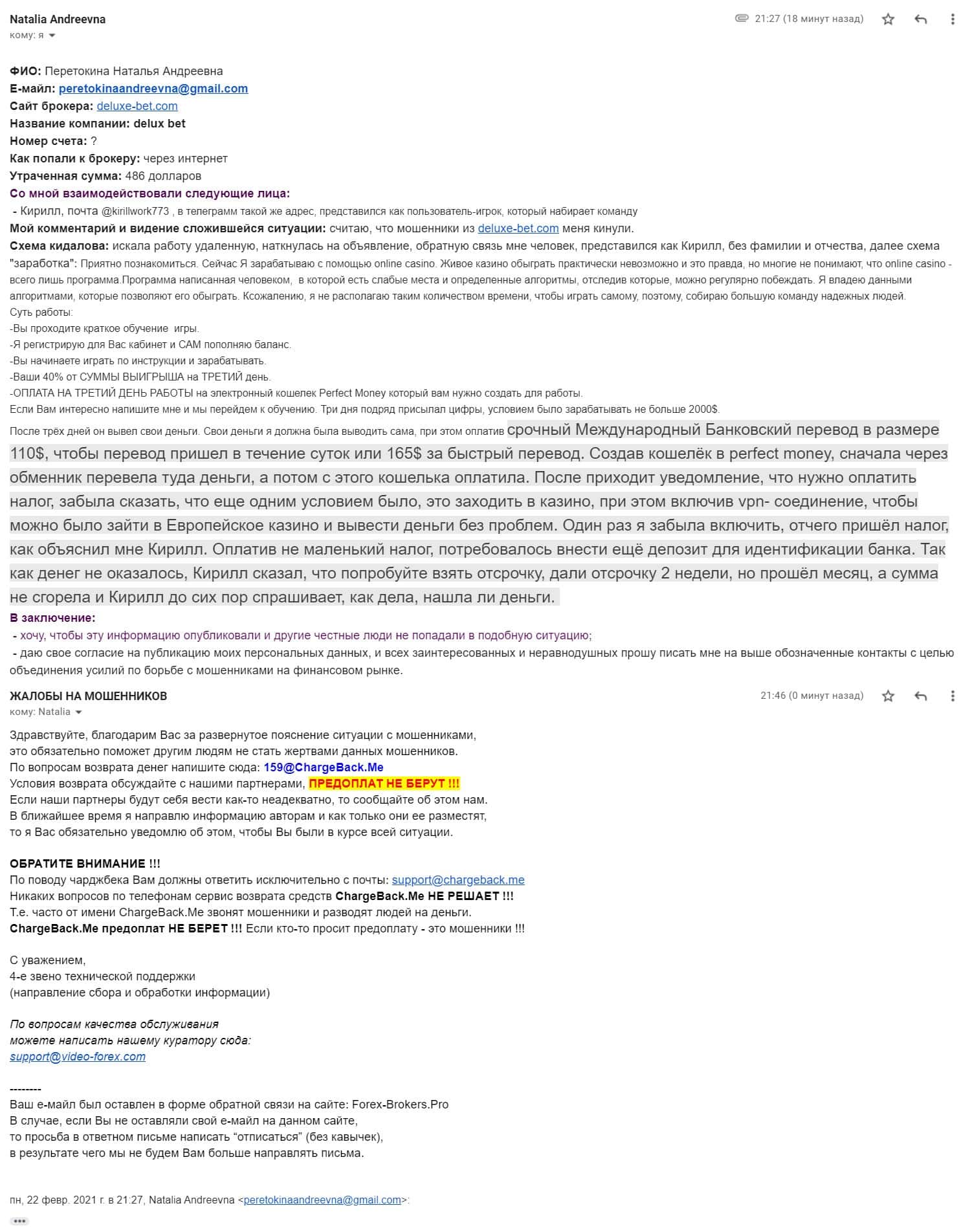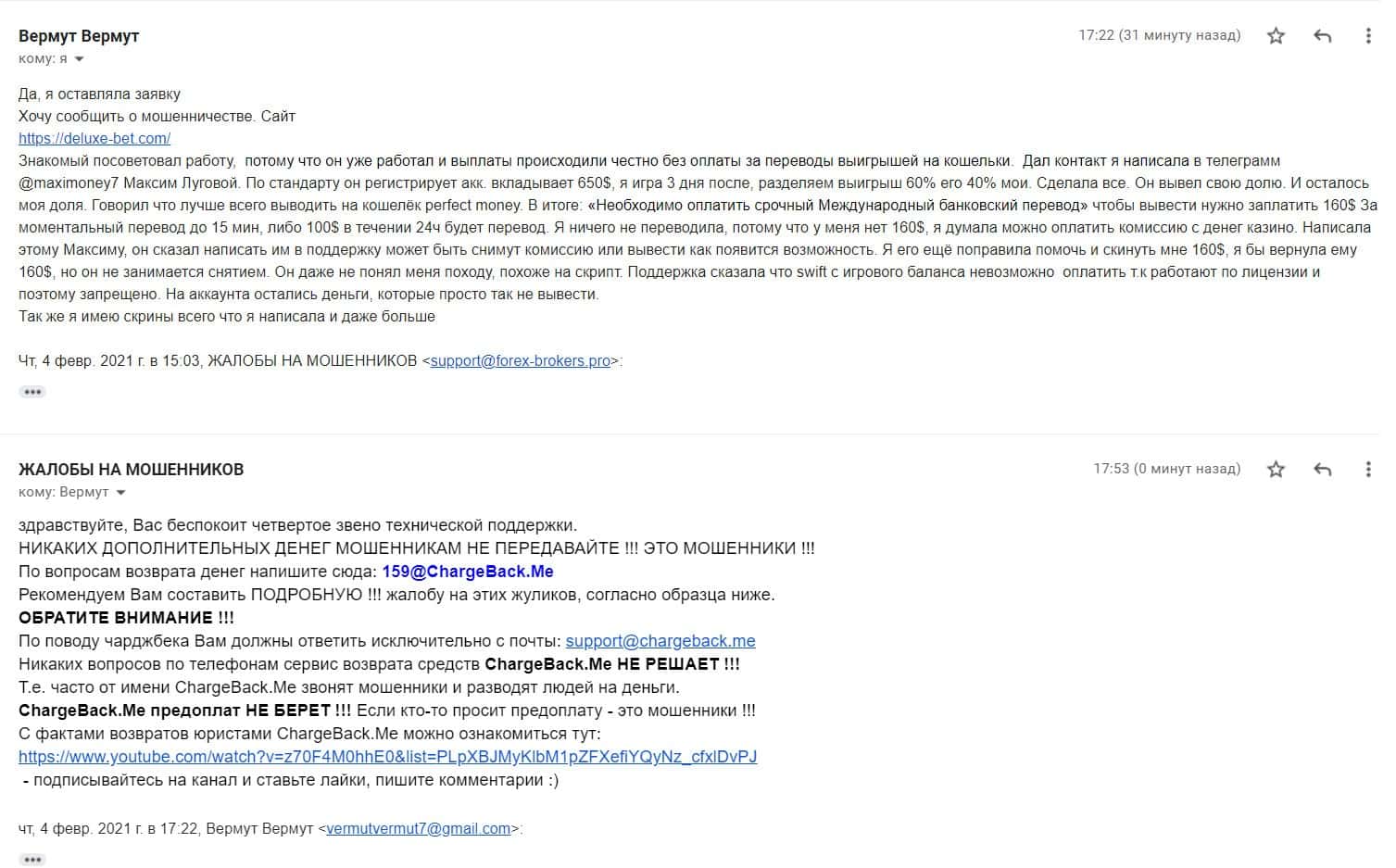 В данном разделе предлагаем увидеть информационный материал в виде жалобы на шулеров Делюкс Бет, которые обманули клиента на 2500 долларов США.