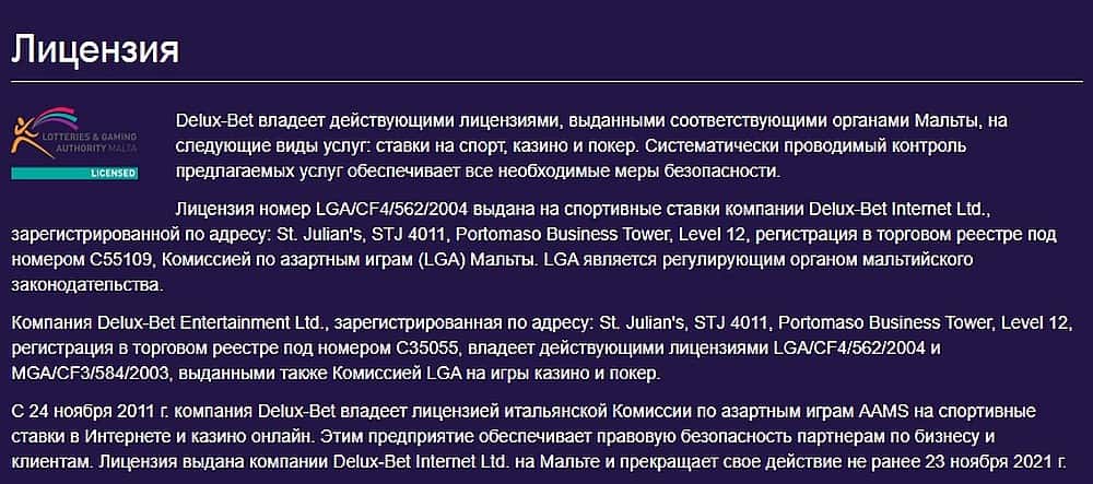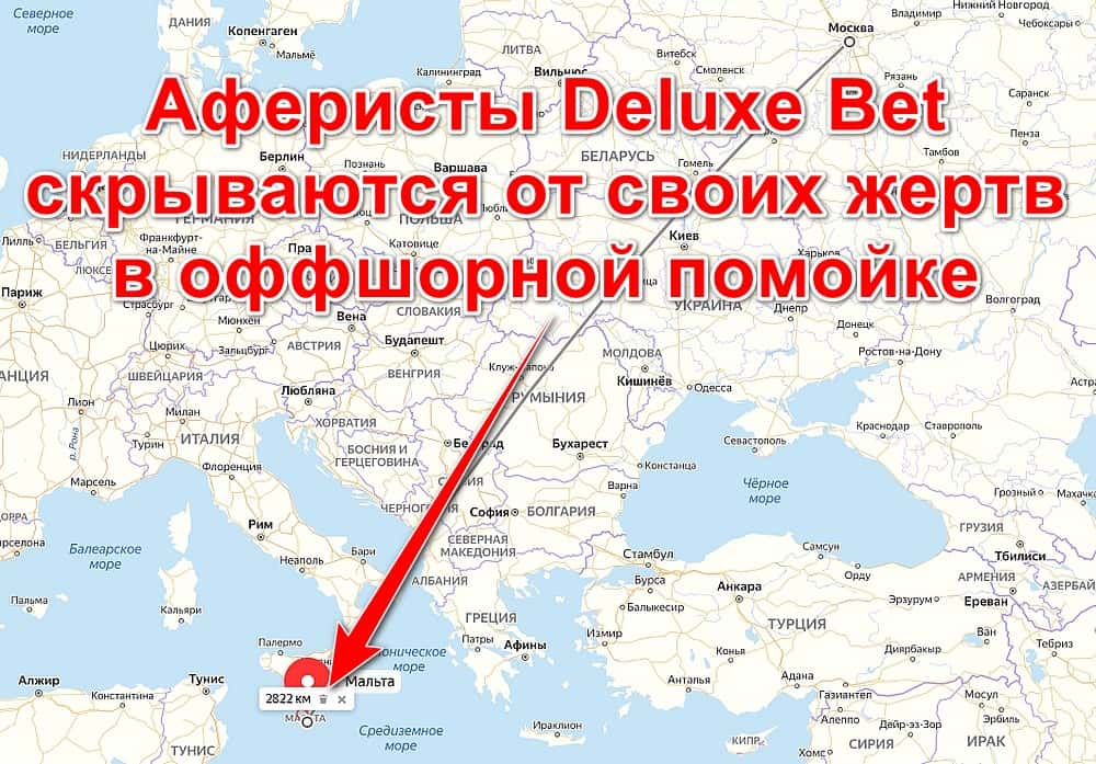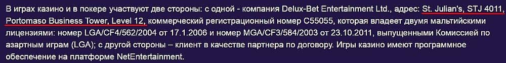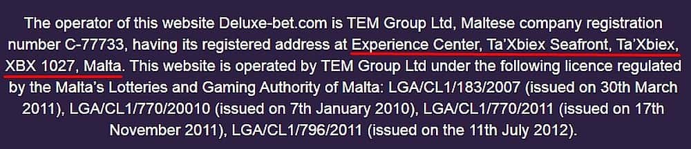 Кидалы Делюкс Бет утверждают, что имеют регистрацию в оффшорной канаве в Мальте, однако адреса приводят разные. Так, что вероятно где-то там обитает этот гэмблинг-лохотрон.