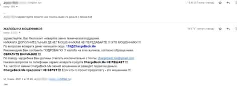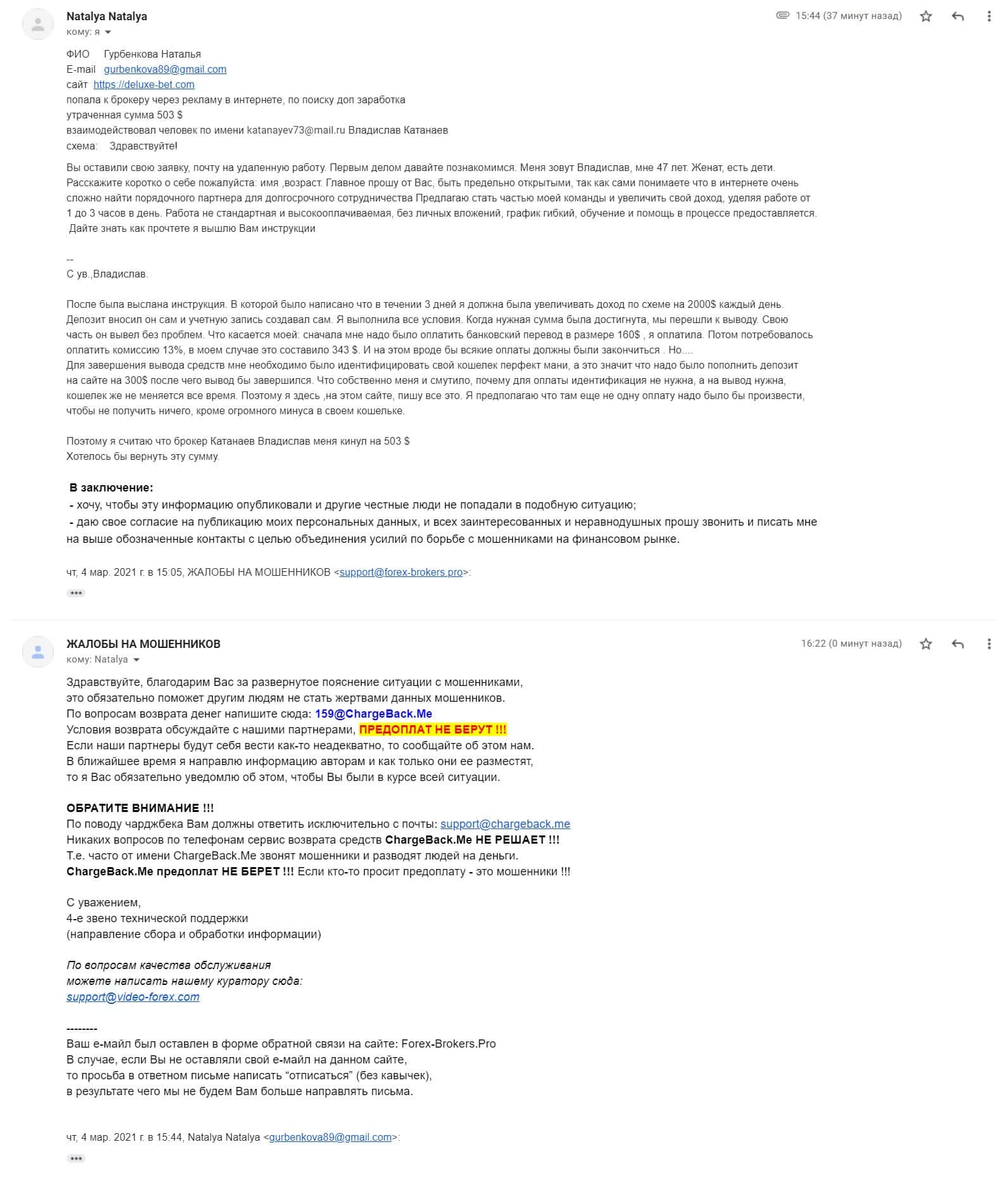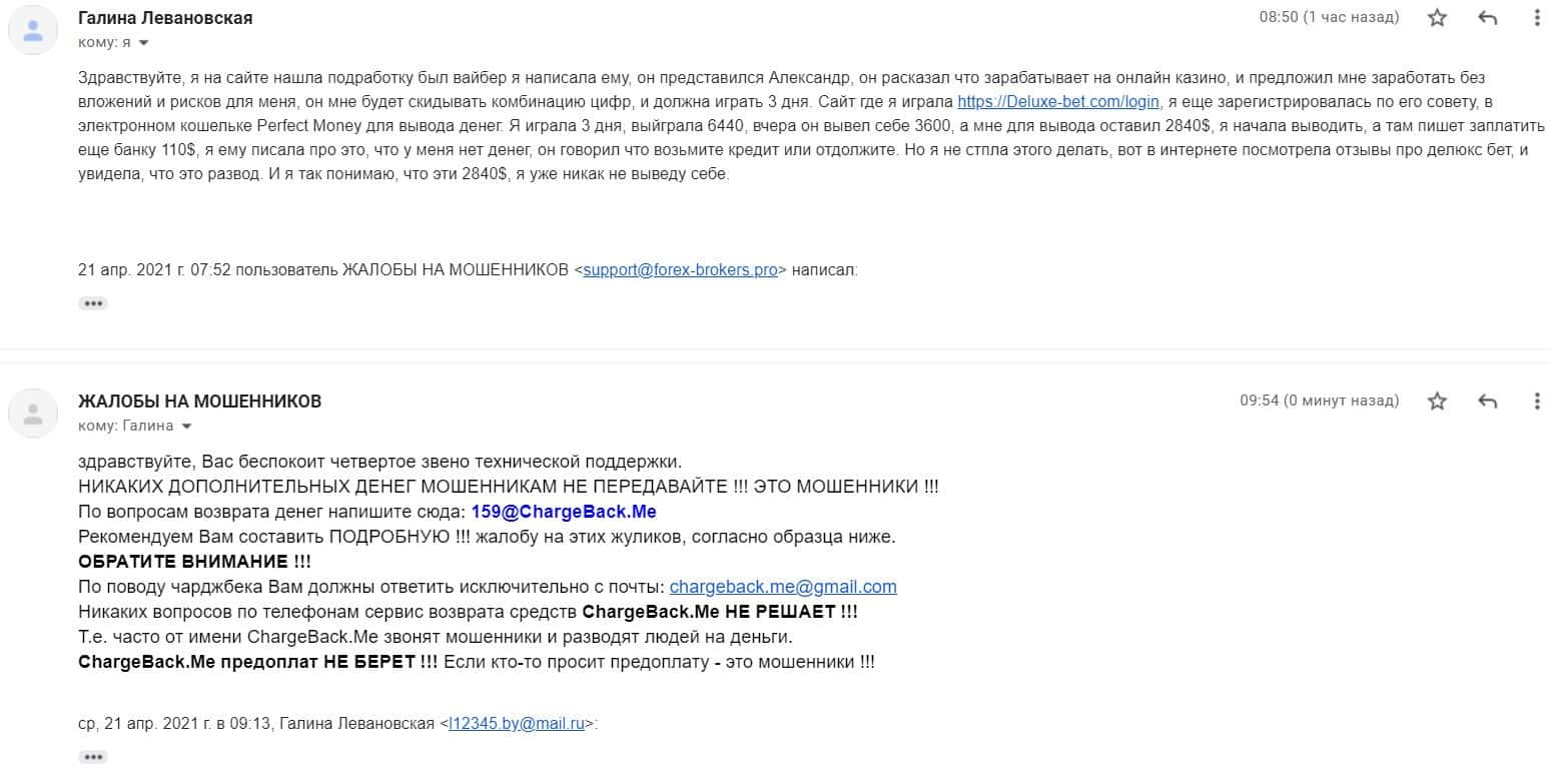 Далее предоставлена жалоба от одной из пострадавших от деятельности шараги Делюкс Бет, которая развела клиентку на 2840 долларов США.