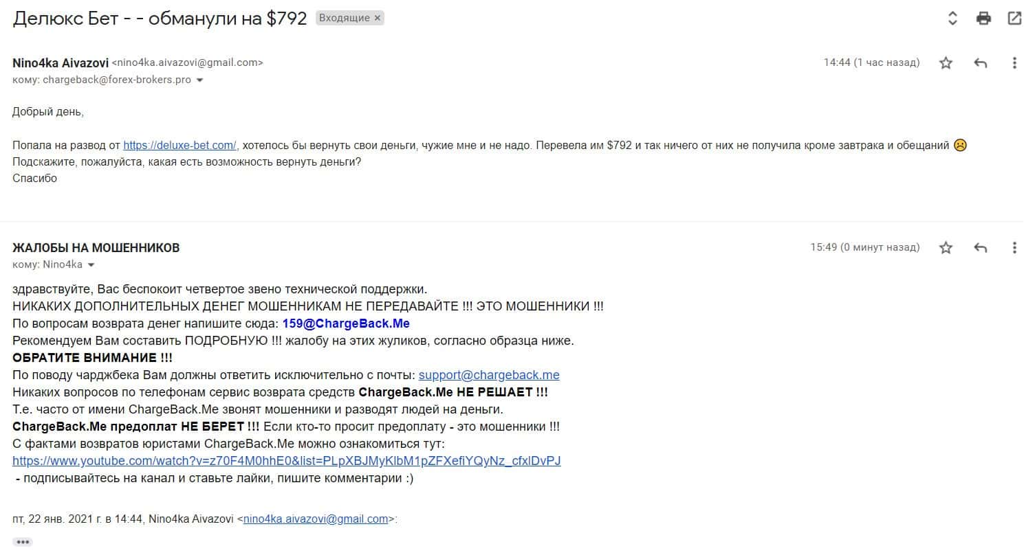 - Аферисты Делюкс Бет кинули клиентку на 2840 долларов США