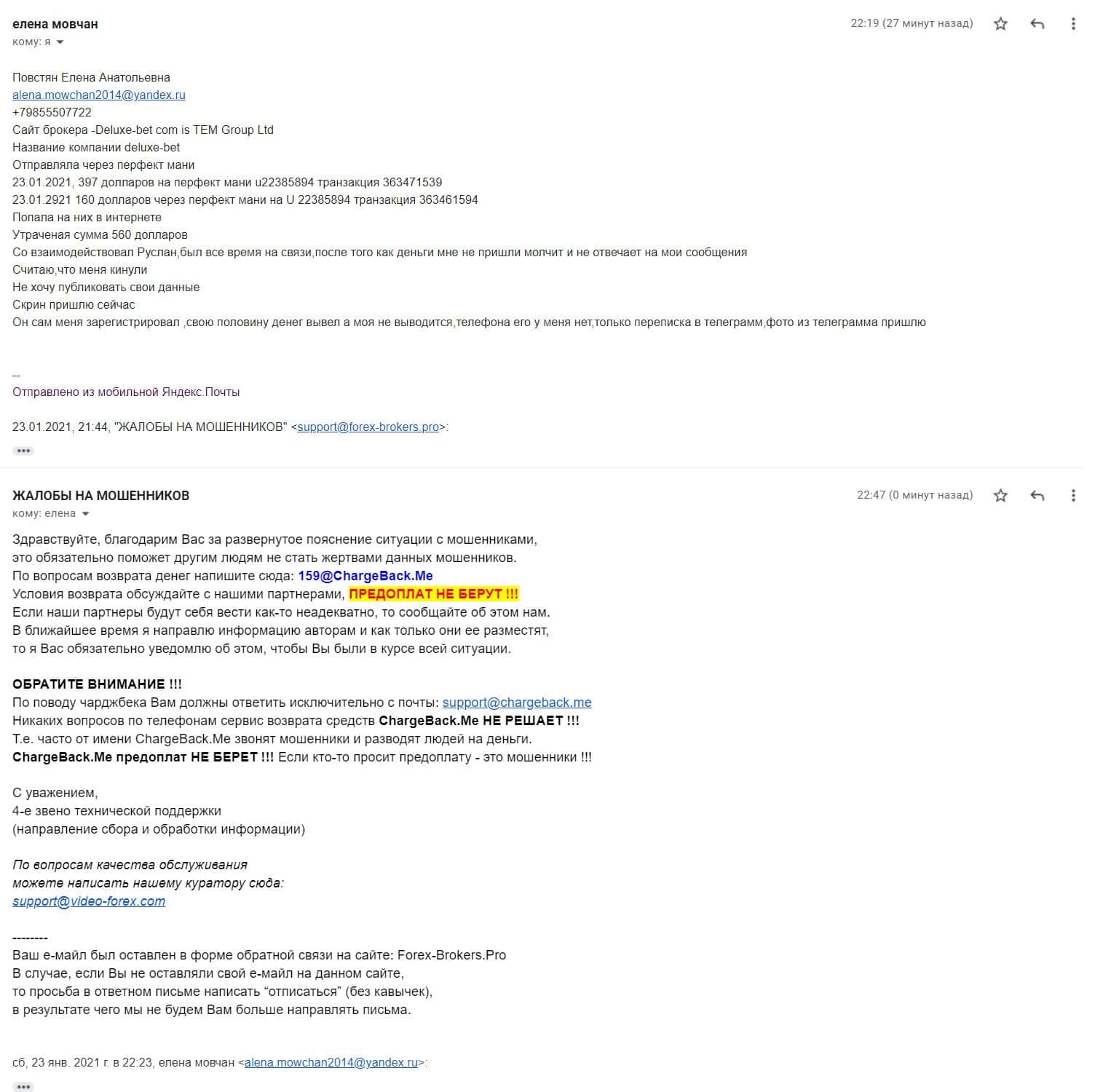Далее предоставлена жалоба о том, что клиент конторы повелся развод со стороны конторы Делюкс Бет и потерял на сайте шараги 2200 $ США.