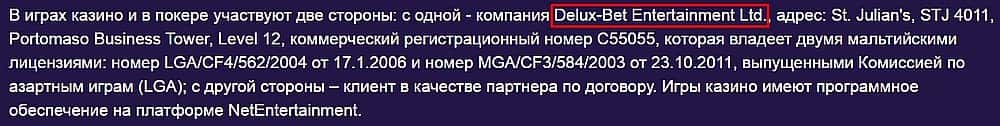 Но, если заглянуть в их клиентское соглашение, то можно обнаружить, что договор мошенники Делюкс Бет, заключают уже от имени другой конторы - Delux-Bet Entertainment Ltd.