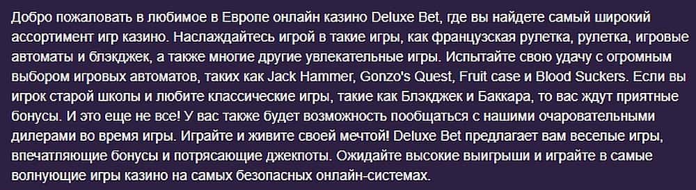 Интерпретация названия фанерного казино "ДелюксБет" тоже не имеет поклонников. Люди не желают видеть в выдаче поискового сервиса Гугл название этого игрового онлайн-позорища.