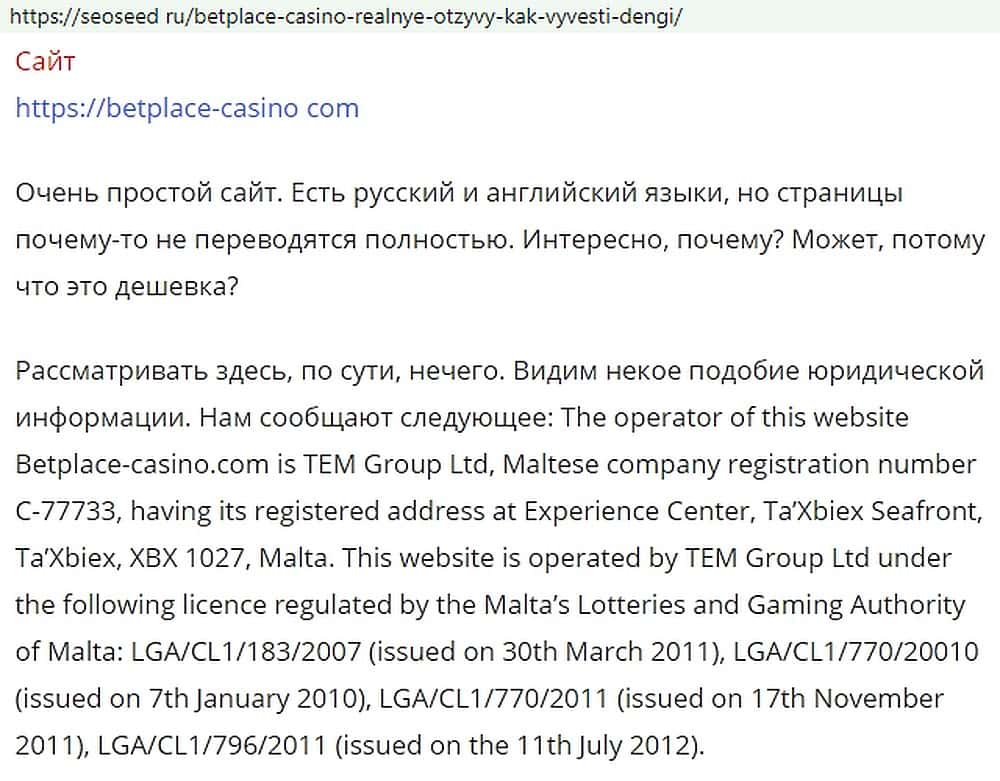 С Бет Плейс Казино практически та же история, что и с предыдущими лохопритонами. Жулики обставляют все так, чтобы у игрока не было ни малейшей возможности вернуть деньги.