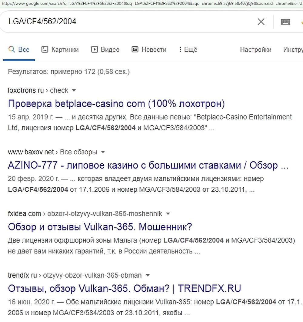 Но вот забив номер этой "лицензии" в поисковую систему, можно сразу же в первых строках выдачи обнаружить, что ее упоминает как уникальную еще множество игорных лохотронщин.