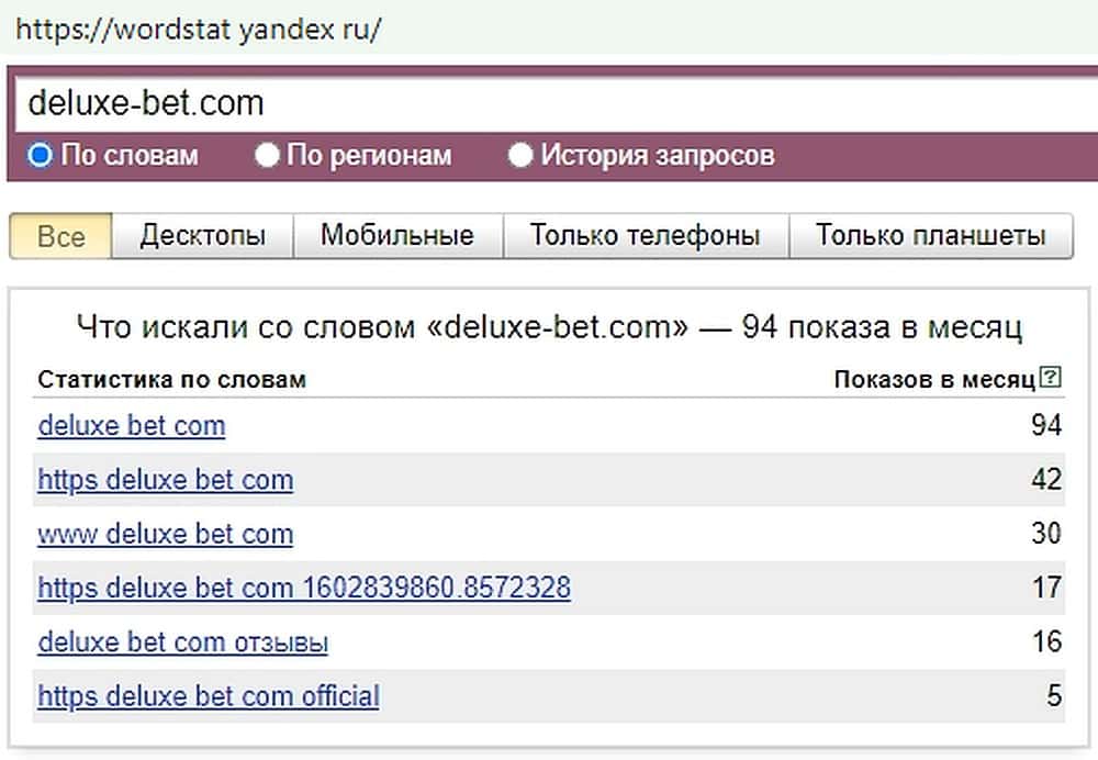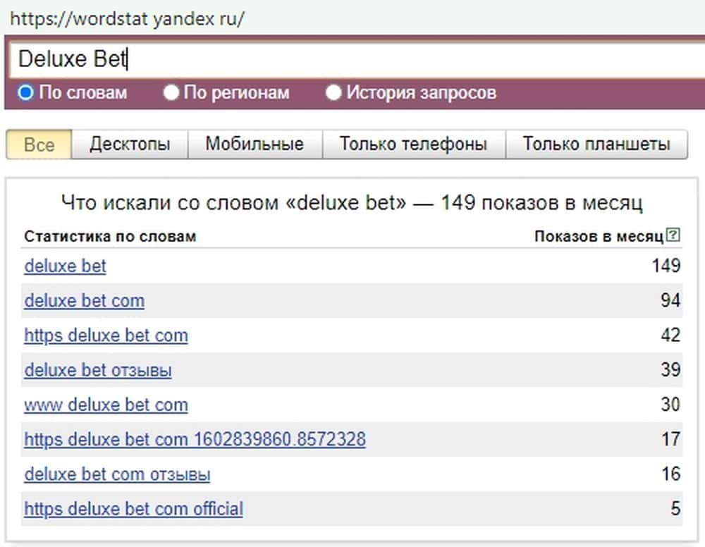 - Как часто ищут лохушню Deluxe Bet пользователи Яндекс?