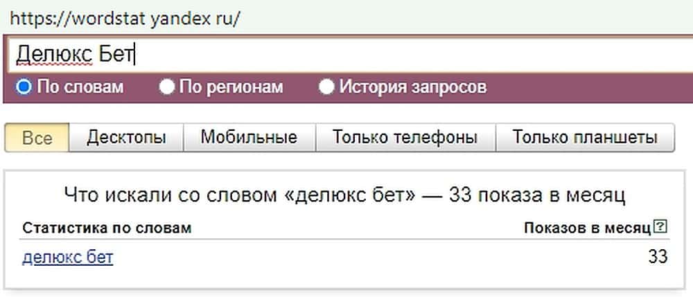 Русскоязычный вариант названия конторы мошенников "Делюкс Бет" искали и того с меньшим усердием. Всего 33 раза в строке поиска Яндекса появлялся подобный запрос.