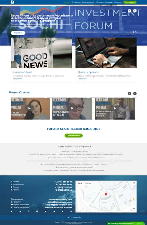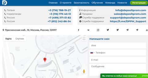 Для связи со своими клиентами и общественностью, контора DepositProm использует множество контактов. Обычно новичкам это внушает доверие, но опытный инвестор знает, что когда его кинут в хайпе Депозит Пром, то никто не ответит ему, сколько бы ни было там контактов. А вот все данные в подробностях: