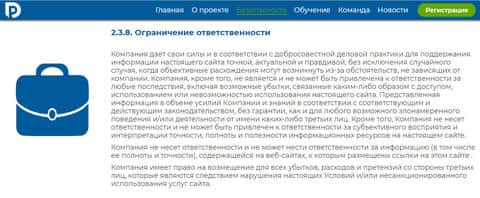 Согласно информации, которая размещена в разделе сайта Безопасность, контора DepositProm не будет нести ответственность за те убытки, которые понесет клиент при работе с ними. Также стоит отметить, что довольно странная подача соглашения или договора, как его еще назвать в куче с остальной информации, что тоже должно насторожить.