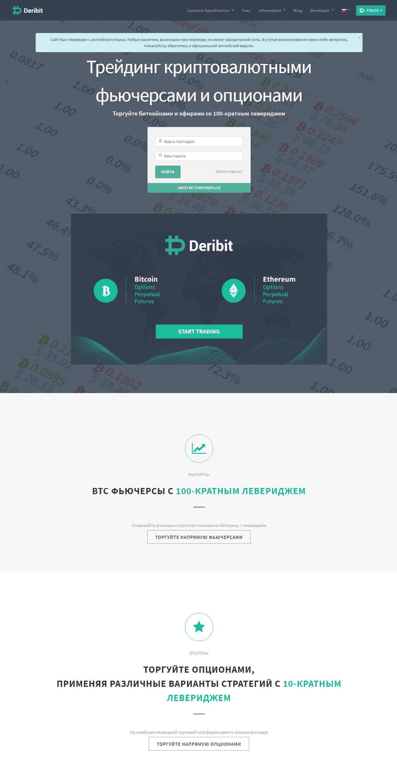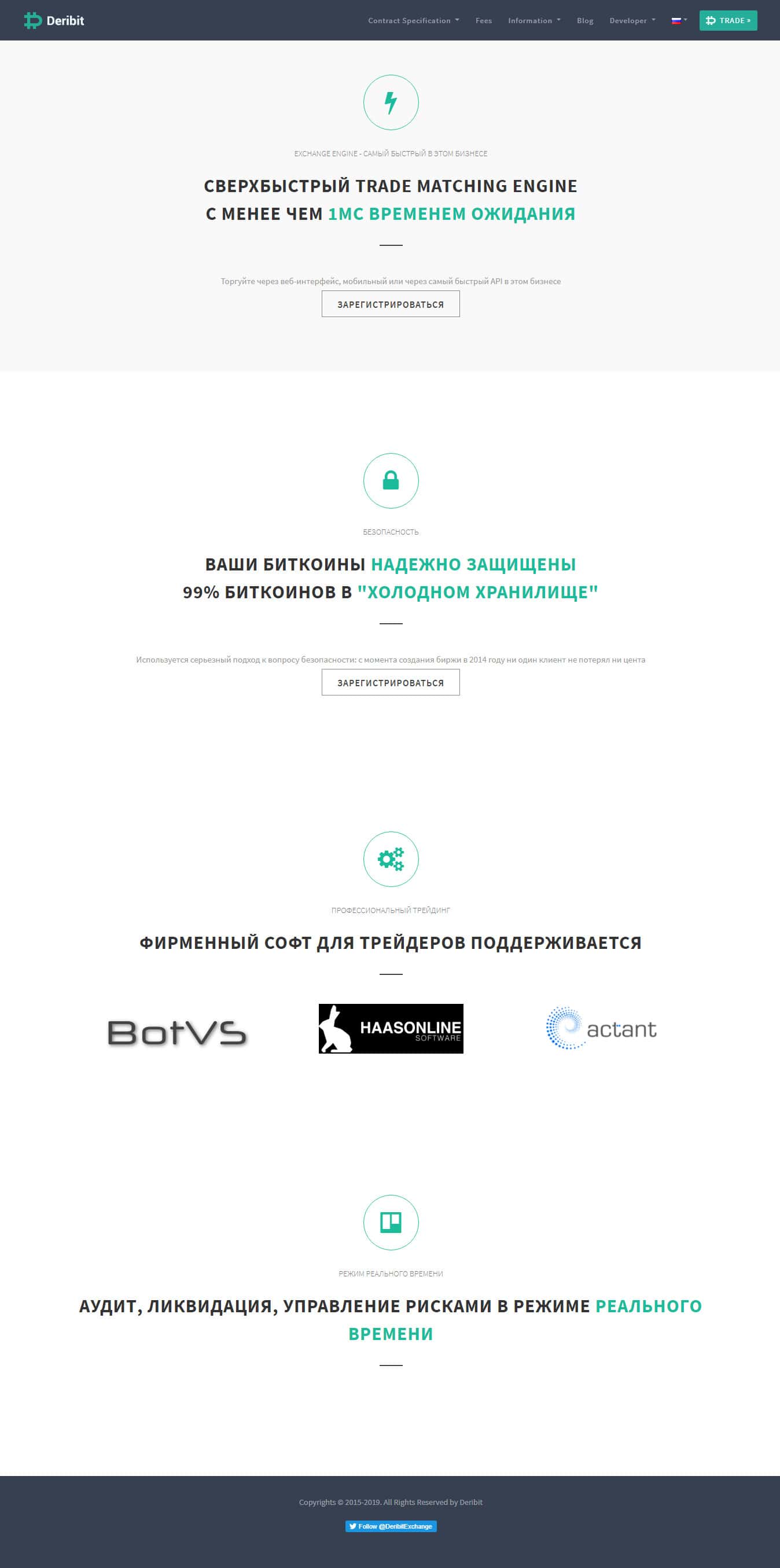 Мошенническая контора Дерибит создала свой сайт как попало, лишь бы люди велись на его красочность и несли деньги. Минимум информативности и максимум мусора позволяет им манипулировать сознанием потенциальных жертв. Для тех, кто хочет моментально разбогатеть, они предоставляют плече в 1 к 100, на чем и ловится большинство клиентов.