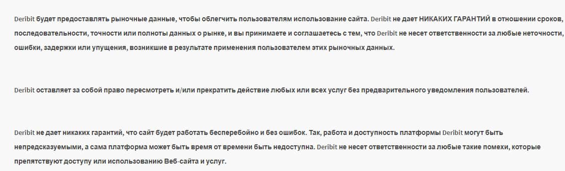 Касательно договора, контора Дерибит в своем регулирующем документе рассказывает, что они не дают никаких гарантий в отношении сроков, последовательности, точности и полноты о рынке. Поэтому если что-то случится с вашими деньгами, по их же вине, то компенсаций никаких не будет.