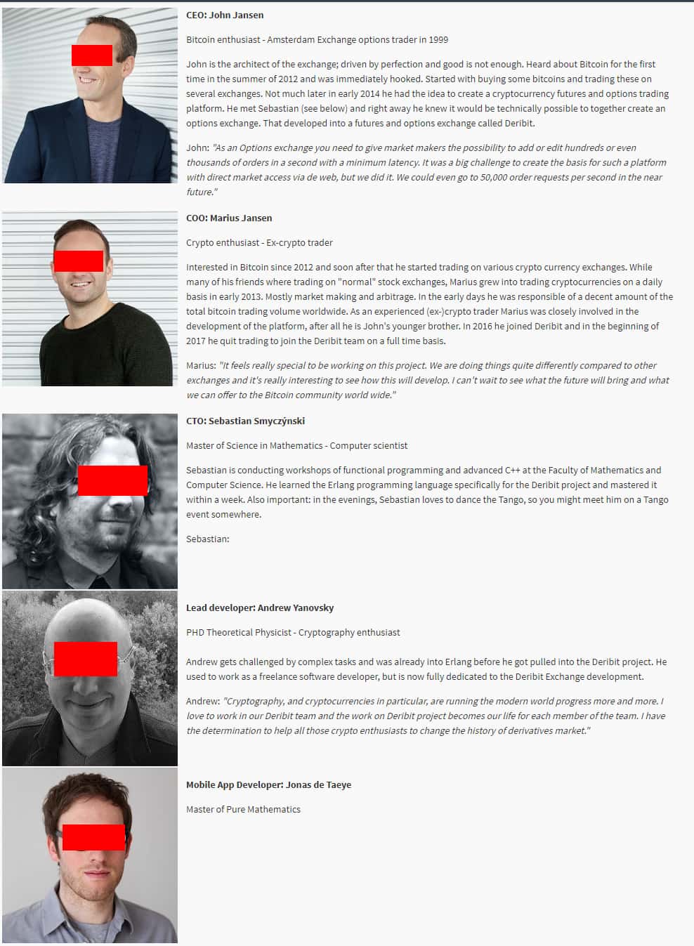 Касательно руководства конторы Дерибит, жулье выставило на показ каких-то подставных лиц, которые вряд ли являются реальными руководителями. Обычно так делают подобные лохотроны, которые хотят привлечь больше внимание лохов и войти к ним в доверие. И все же оставим их данные и фотографии ниже: