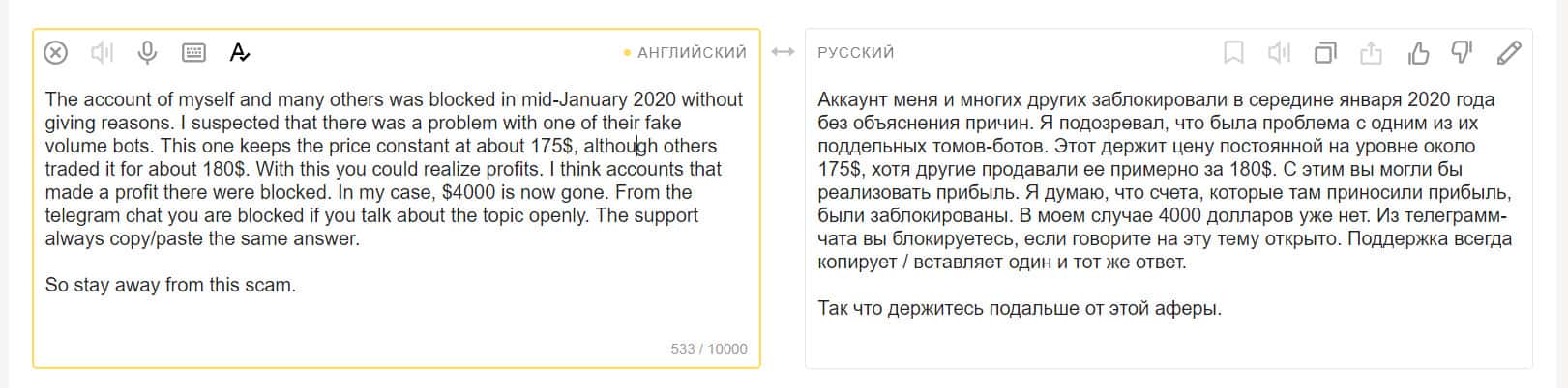 Далее, торговые объемы сильно раздуты, реальные обороты очень далеки от заявленных. Делается это для привлечения внимания пользователей. На деле мошенники торгуют сами с собой, накручивая объем сделок при помощи торговых ботов.