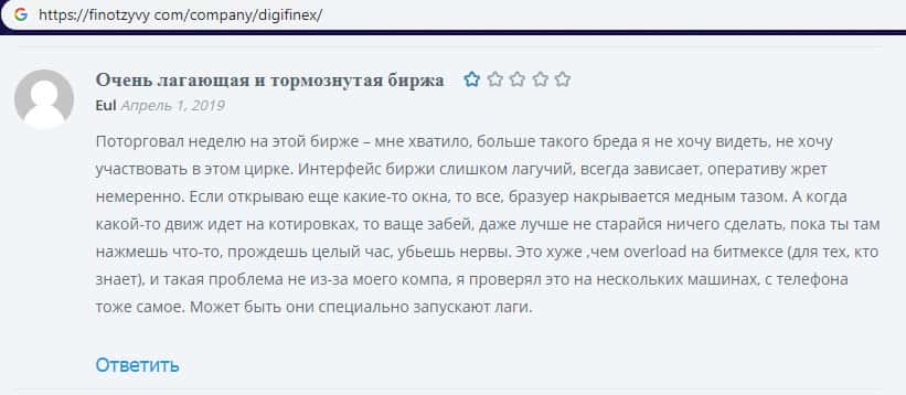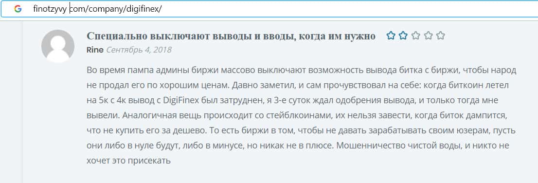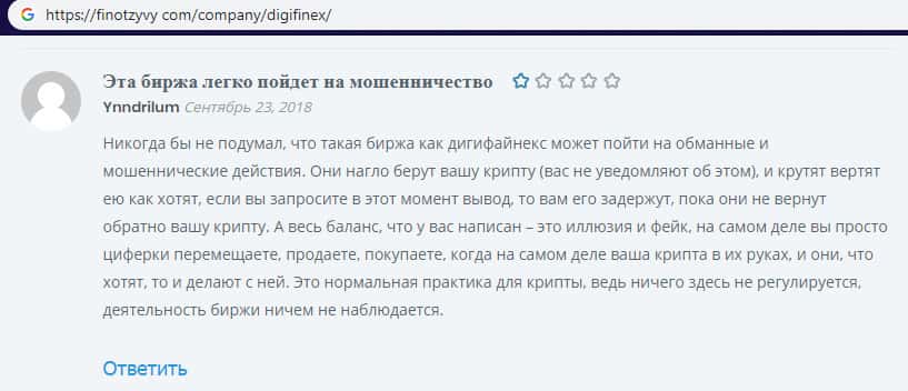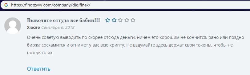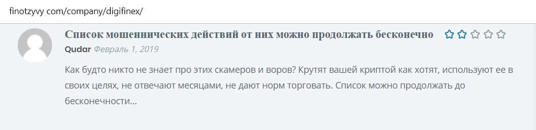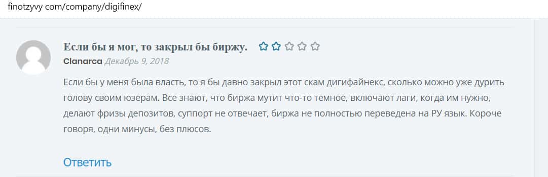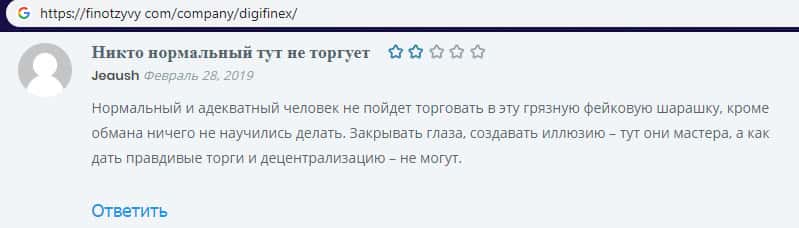 На изображении, расположенном ниже, вы можете наглядно увидеть негативный комментарий в сторону проходимцев DigiFinex с веб-площадки финотзывы ком, который связан с тем, что наивный пользователь сети интернет не рекомендует иметь дело с аферистами Диги Файнекс так это очередная мошенническая помойка, которая рассчитана на развод и кидалово.