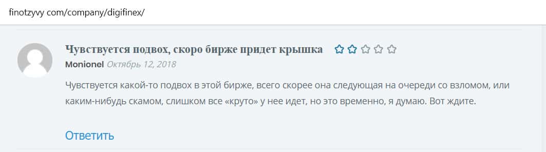Комментарий пользователя на сайте Финотзывы: биржа Диги Файнекс скоро соскамится