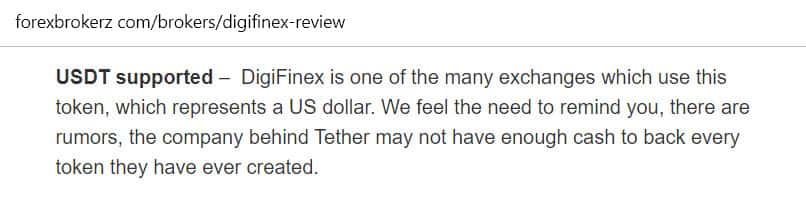 Наконец, биржа DigiFinex поддерживает токен USDT, который привязан к американскому доллару. Это неплохой момент, однако, у компании может не хватить средств на его обеспечение, если вдруг пользователи решат продать его. Если учесть, что биржа мухлюет с оборотами, это вполне реально.