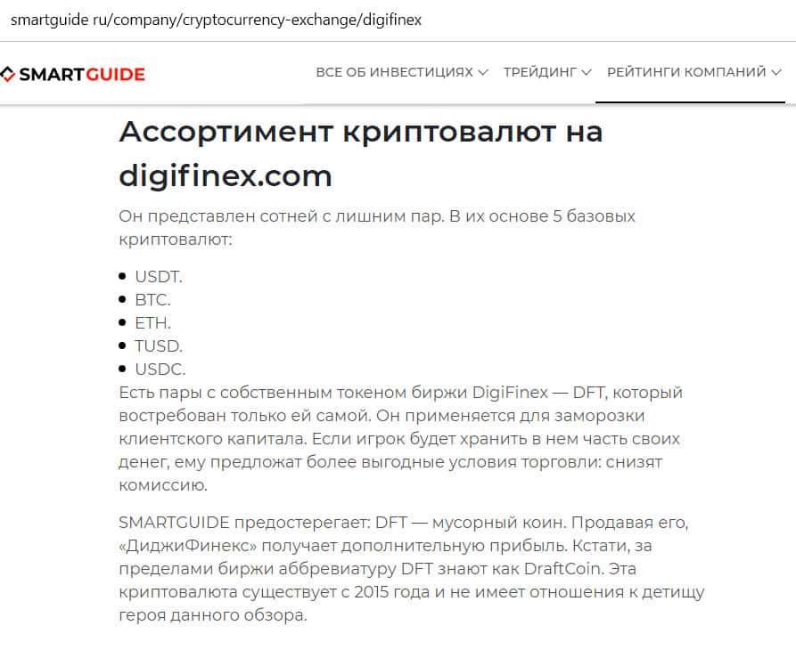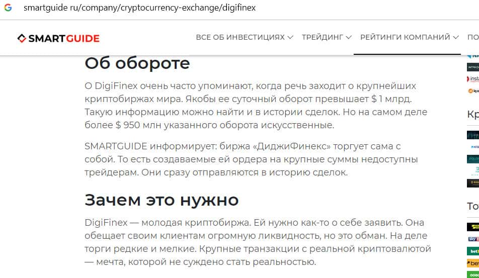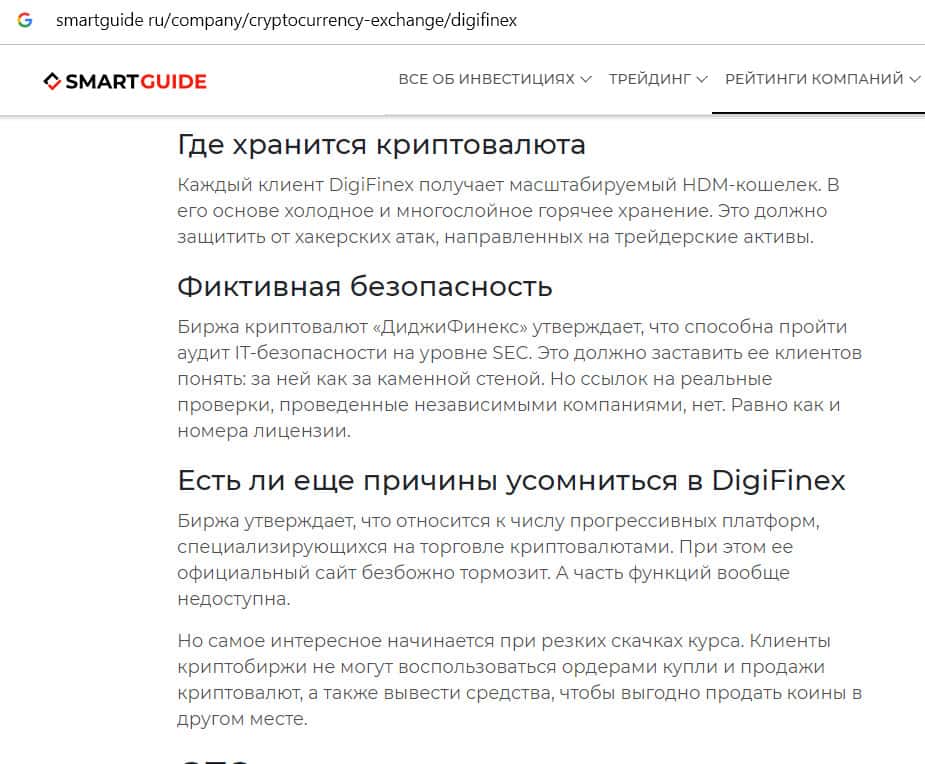 Критика сомнительной криптобиржи Диги Файнекс на сайте smartguide ru