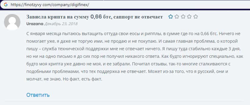 На ниже расположенном изображении вы можете увидеть и прочесть очередной негативный комментарий в сторону жулья Диги Файнекс, который связан с тем, что проходимцы DigiFinex попросту отказываются выводить деньги наивного пользователя сети интернет, а так же служба поддержки аферистов Диги Файнекс попросту игнорирует любые обращения пользователя.