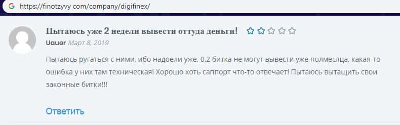 На изображении, расположенном ниже, вы можете наглядно увидеть и прочесть еще один реальный негативный отзыв в сторону мошенников Диги Файнекс, который конкретно связан с тем, что аферисты DigiFinex попросту не выводят средства наивному пользователю, который решил открыть у проходимцев Диги Файнекс счет, что закончилось потерей средств на нем.