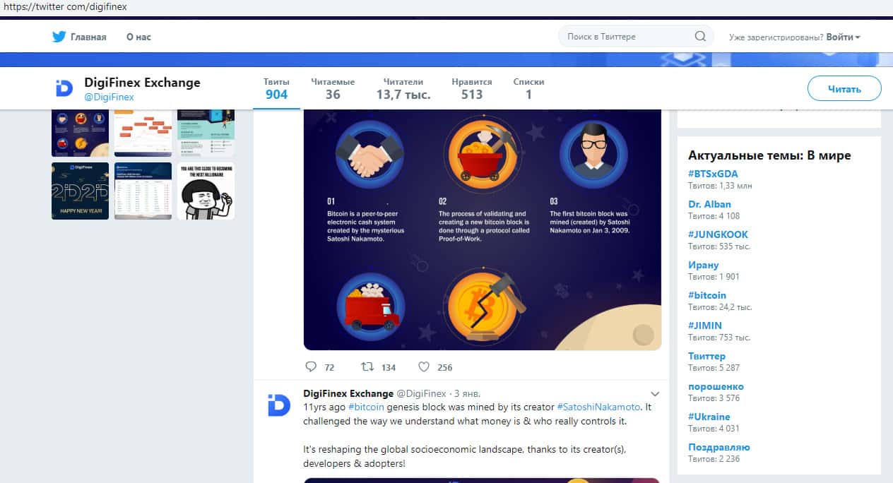 Имеется у аферистов Диги Файнекс и страница в социальной сети Twitter, где у шулеров DigiFinex размещена довольно стандартная и типичная лапша на уши наивной клиентуре и накручено около десяти тысяч подписчиков. На изображении, расположенном ниже, вы можете наглядно увидеть внешний вид страницы аферистов в социальной сети Твиттер.